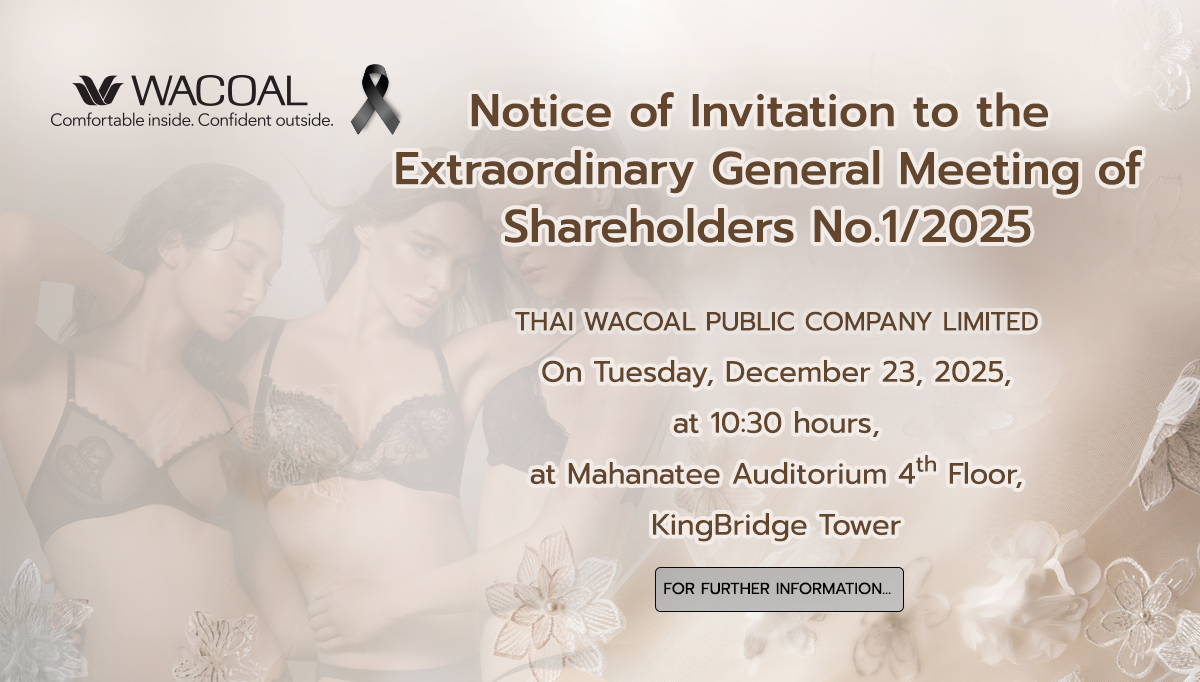 Home About Us Vision, Mission and Values Company Background Corporate Business Nature Organization Structure The Board Corporate Group Structure The Management Articles of Association < The Board Board of Directors Audit Committee Nomination and Remuneration Committee Risk Management Committee Corporate Governance and Sustainable Development Committee Executive Committee < The Management Products Ladies' Lingerie Children Wear Ladies' Outerwear Investor Relations Investor Relations Homepage Company Profile Financial Highlights Annual & Quarterly Reports Stock Information Shareholder Information Investors News Information Request Investor Relations Homepage < Company Profile Company in Brief Shareholding Structure < Financial Highlights Financial Summary Profitability Stability Per Share Ratios < Stock Information Stock Quote Historical Price < Annual & Quarterly Reports Financial Statements Annual Report (Form 56-1 One Report) Management Discussion and Analysis IR Download < Shareholder Information Shareholders' Meeting Dividend Policy and Payments < Investors News SET Filings IR News IR Calendar Useful Links < Information Request IR Contact E-mail Alerts Corporate Governance Good Corporate Governance Code The Corporate Governance and Sustainable Development Committee Report Corporate Governance Report Anti-Corruption Whistleblowing Policy Policy on Governance of Subsidiaries and Associates Directors and Top Management Nomination Policy Risk Management Policy Tax Policy Human Rights Policy Privacy Policy Policy on Security of Data and Computer System Marketing Communication Policy Risk Management Policy Tax Policy Human Rights Policy Privacy Policy Policy on Security of Data and Computer System Marketing Communication Policy Sustainability Sustainability Management Policy Sustainability Strategy Social Policy Environmental Policy Driving Business for Sustainability Business Value Chain Management News Careers Contact Thai Wacoal Public Company Limited Wacoal Siracha Co., Ltd. Wacoal Lamphun Co., Ltd. Wacoal Kabinburi Co., Ltd. Pattaya Kabinburi Co., Ltd. Tora 1010 Co., Ltd. Wacoal Maesot Co., Ltd.
