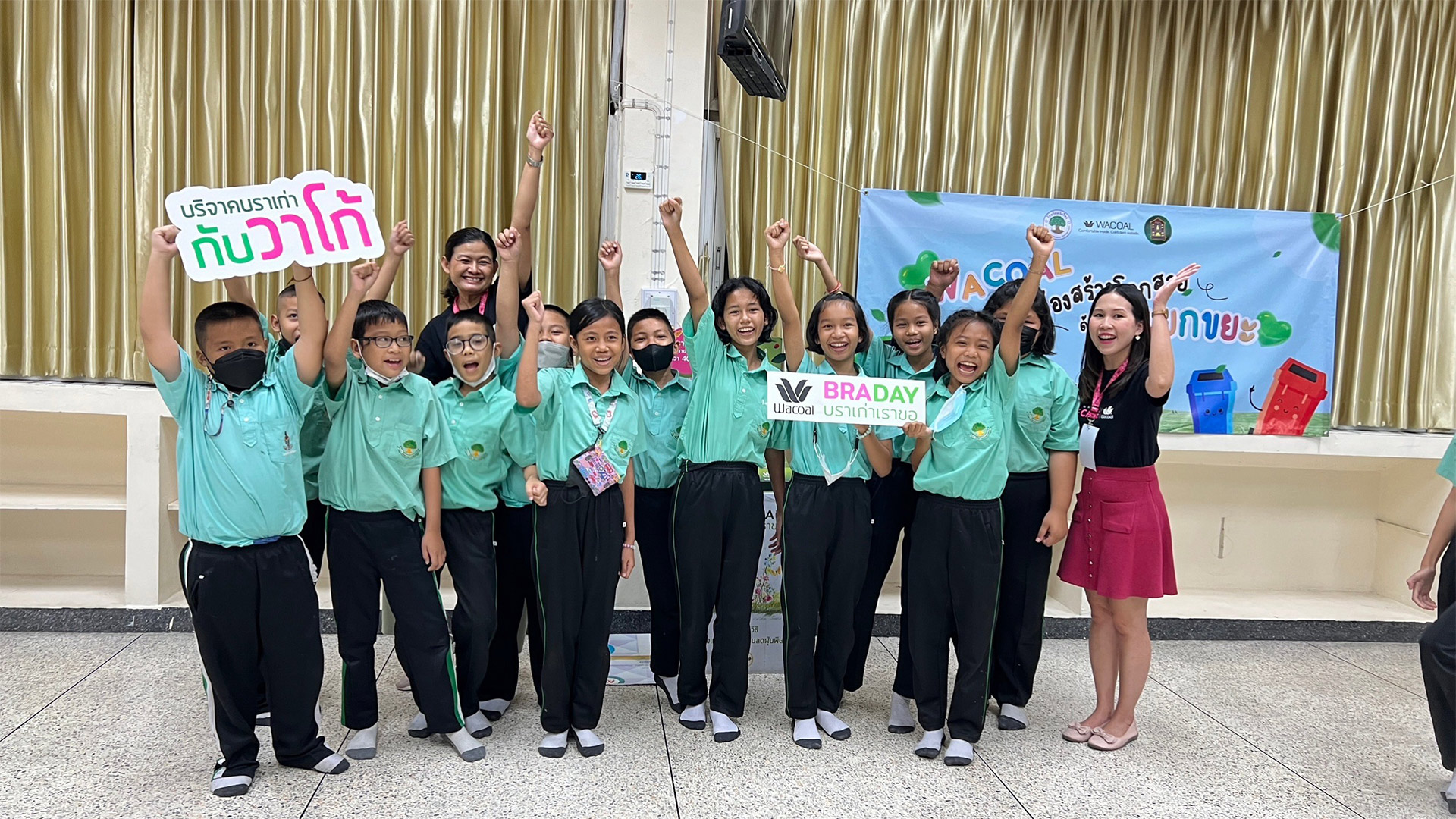 Wacoal is committed to operating its business while taking care of society, the community, and the environment. New employees participated as volunteers in a community service activity (Wacoal Spirit) under the concept of "Wacoal Invites Youths to Go Green." The initiative involved six schools in the communities surrounding the company: Wat Sai School, Wat Lat Bua Khao School, Wat Chan Nai School, Wat Phai Ngoen School, Wat Chan Nok School, and Wat Ratcha Singkhon School. The goal was to raise awareness among young people about environmental issues.